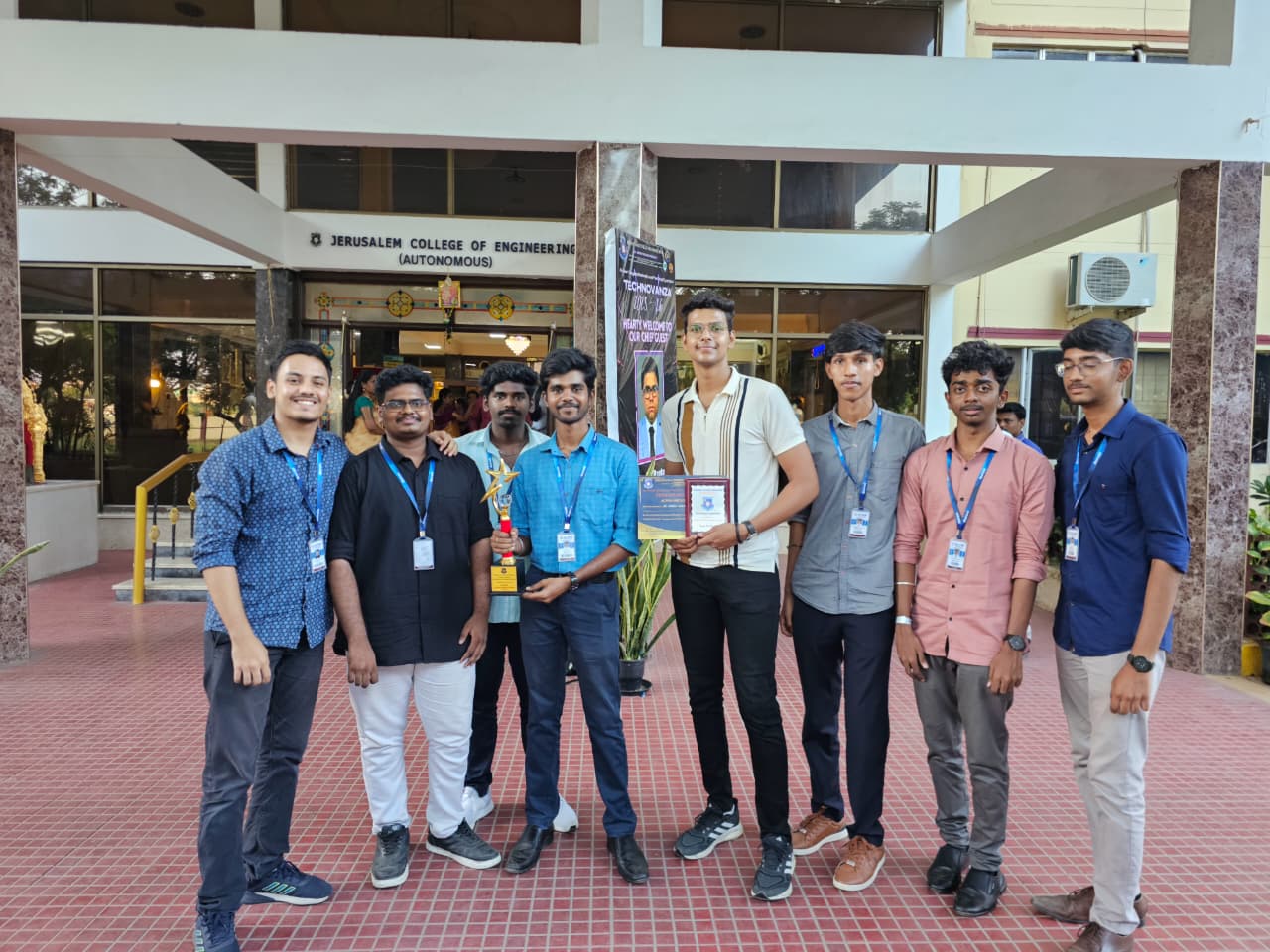 Congratulations to Rakesh R from the Department of M.Tech CSE (III Year, 2022–2027) and Abinaya B from the Department of IoT (III Year) for securing the First Prize in the Paper Presentation category at Technovanza 2025, the National Level Technical Symposium organized by Jerusalem College of Engineering!