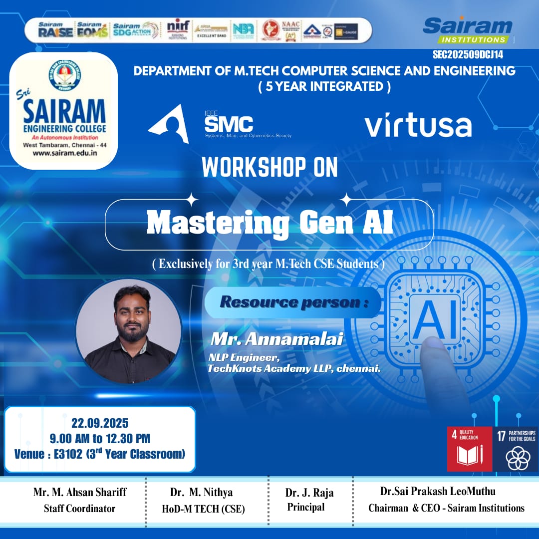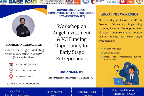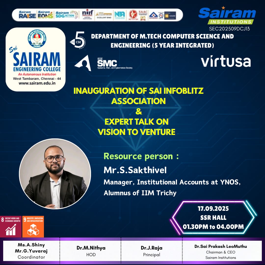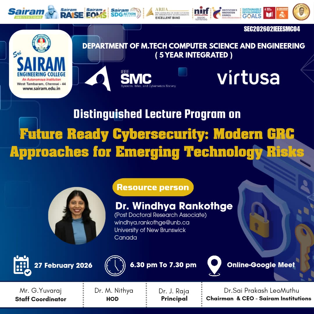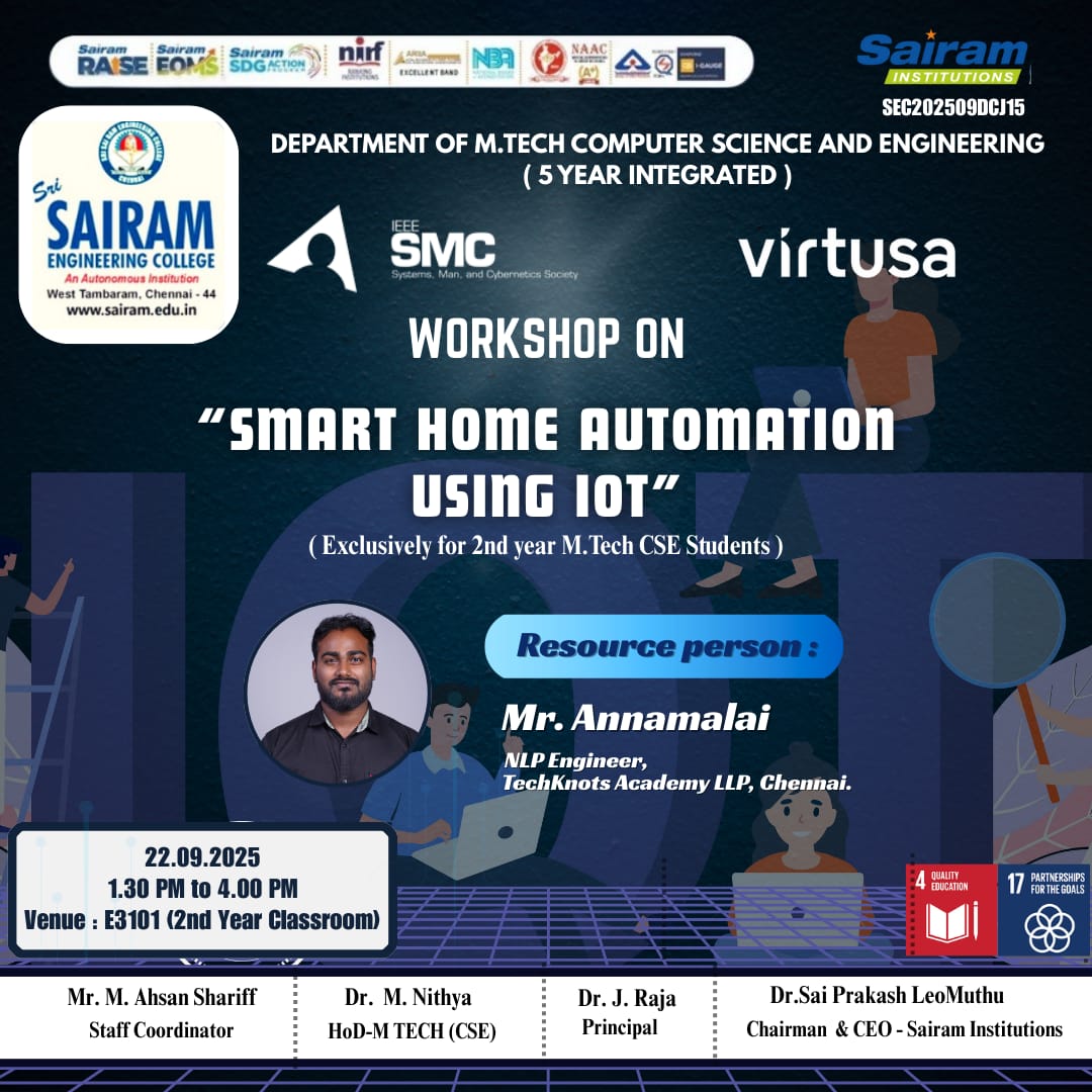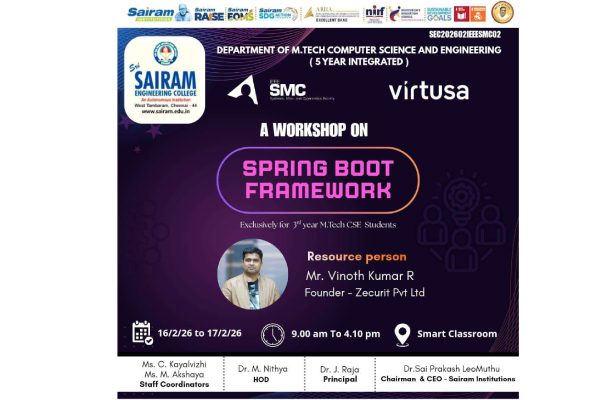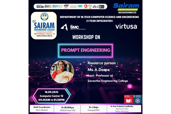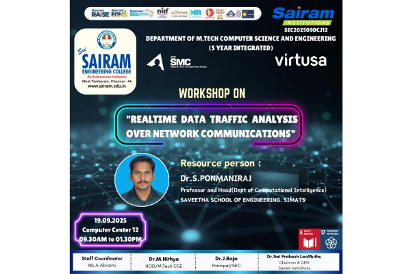 The department of M.Tech Computer science & engineering Integrated is a 5 year program offering BTech & MTech degree with the objective to provide accelerated advanced industry focused learning. Emerged in the academic year 2021-2022, adding to Sri Sairam engineering college’s list of esteemed programs, the integrated program inherits the core curriculum from CSE department, including cutting edge technologies like Big Data Analytics, Internet of Things, Design Thinking, Internet of Things, BlockChain Technology, Artificial Intelligence, Cloud computing, Machine Learning,Full stack Development and Data Science. The department provides a platform of learning and practicing real time projects with its excellent lab…