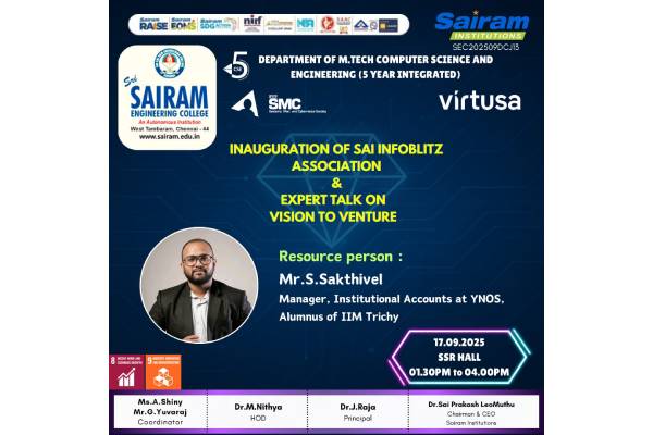 Department of M.TECH – COMPUTER SCIENCE AND ENGINEERING (5 Years Integrated) Powered by Virtusa organized the Association Inauguration – SAI INFOBLITZ along with an Expert Talk on “Vision to Venture” for M.Tech CSE students on September 17, 2025.