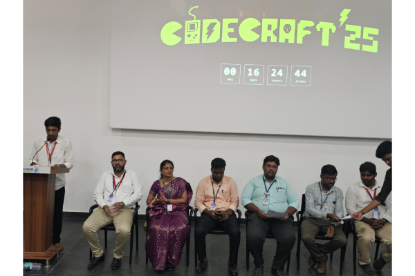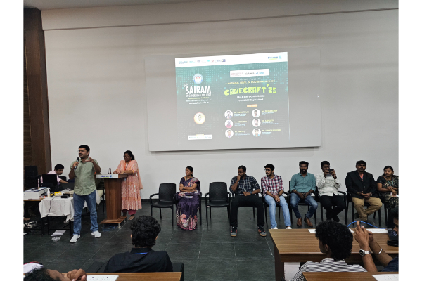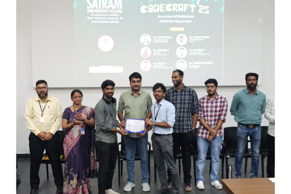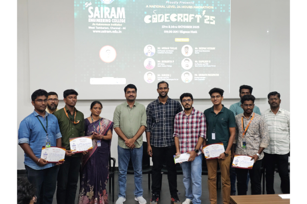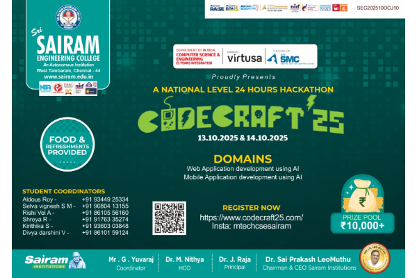 The Department of M.Tech. Computer Science and Engineering (5 Years Integrated), in association with IEEE SMC, proudly organized CODECRAFT’25, a State Level 24-Hour Hackathon, held from 13th to 14th October 2025 at Sri Sairam Engineering College, Chennai.