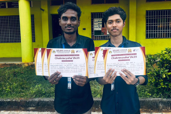 We are delighted to share that Mr. Saif Ahamed Sait and Mr. Yugesh R, second-year students of M.Tech – Computer Science and Engineering, have showcased remarkable performance at Chakravyuha’2K25, organized by the Department of Computer Science and Engineering, Gojan School of Business and Technology, on 11th October 2025. The duo secured First Place in the PPT Presentation, Third Place in the Next Gen Ideas competition, and also received a Participation Certificate in the Lightning Presentation vent. Their innovative ideas, technical excellence, and enthusiasm exemplify the spirit of our department and institution.